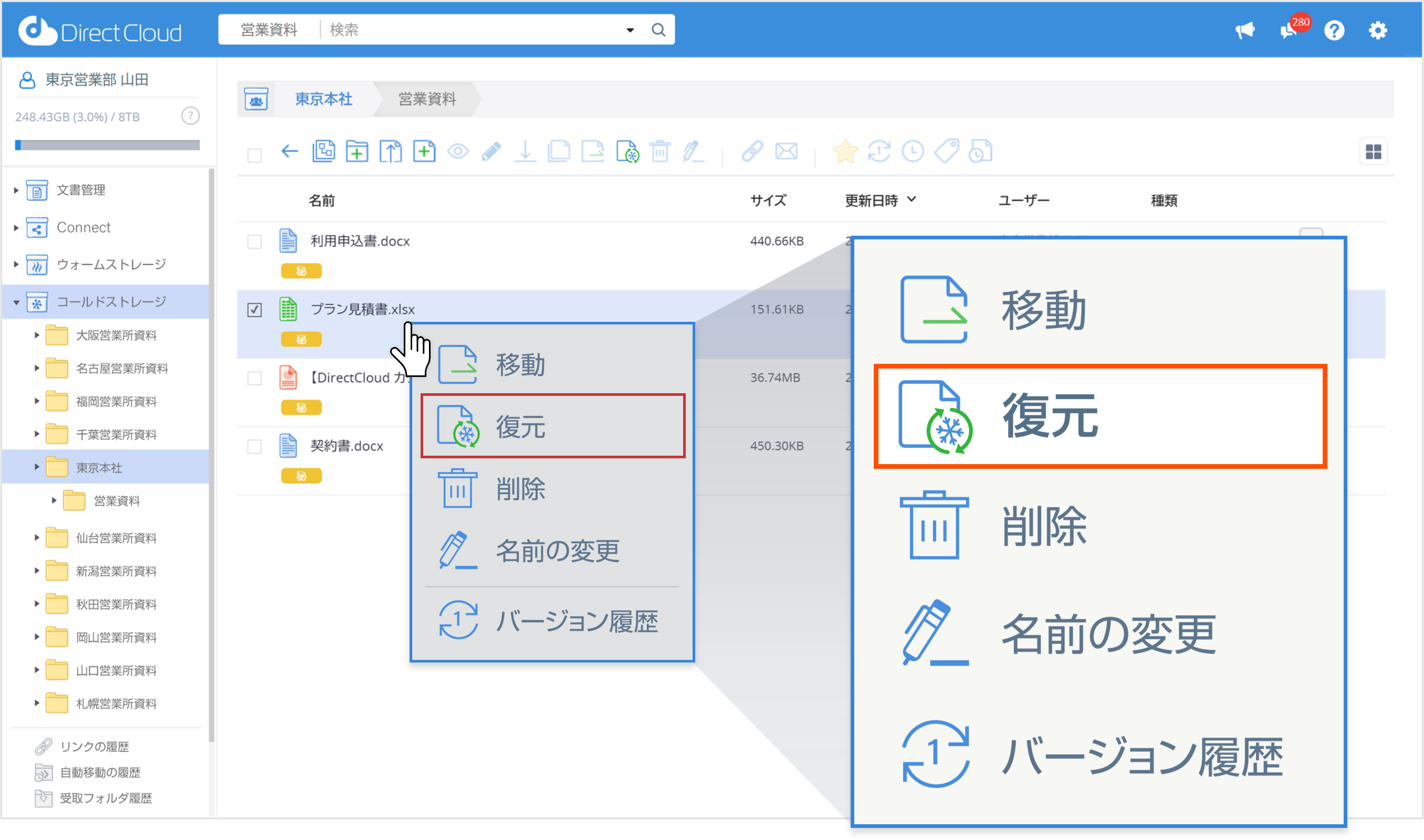 使わなくなったファイルを低コスト領域に移動することで、利用者自身が検索してファイルを探し出すことができます。