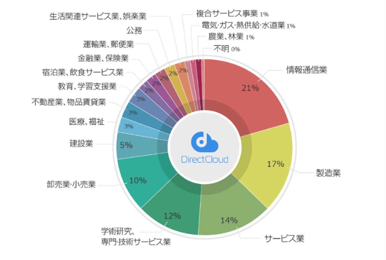DirectCloudは、情報通信業(21%)、製造業(17%)、サービス業(14%)、学術研究・専門・技術サービス業(12%)、卸売業・小売業(10%)など、業種・業界を問わず多くの企業様にご利用いただいております。