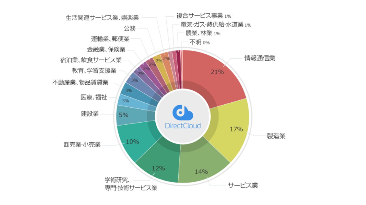 DirectCloudは、情報通信業、製造業、サービス業、専門・技術サービス業、卸売・小売業など、さまざまな業界で導入が進んでいます。