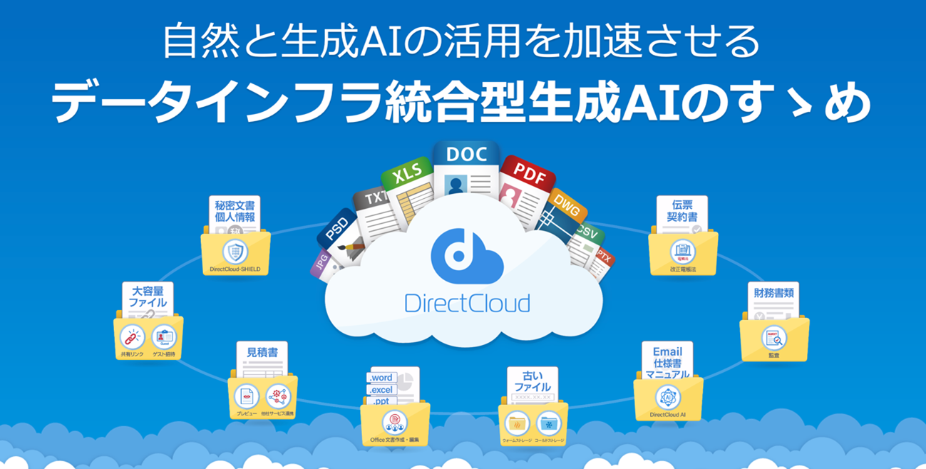 法人向けクラウドストレージである「DirectCloud」は、普段お使いのファイルサーバー、すなわち「データを保管する場所」そのものにAIを実装する「データインフラ統合型AI」として「DirectCloud AI」を提供しています。これにより、企業は特別な準備をすることなく、日々蓄積される文書やナレッジを安全な環境でAIに学習させ、全社的にAI活用の恩恵を受けることが可能になります。